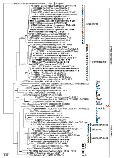 - Raabová, L.; Kovacik, L.; Elster, J.; Strunecký, O. Review of the genus Phormidesmis (Cyanobacteria) based on environmental, morphological, and molecular data with description of a new genus Leptodesmis. Phytotaxa 2019, 395, 1–16. [Google Scholar] [CrossRef]