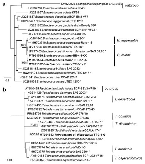 Molecular phylogeny of Sphaeropleales genera based on ITS-1,2 sequencing. (a) Bracteacoccus (only ITS-2) and (b) Tetradesmus. The phylogenetic tree was calculated by the Bayesian method, including posterior probabilities (PP) with additional maximum likelihood bootstrap values (BP); branches are supported by both methods in bold (BP > 60% and PP > 0.9). Authentic strains marked with an asterisk, original strains from this study in bold. 1 Identical to Bracteacoccus minor TTF-1-1-M (MT991533), TTF-2-1-J (MT991535), TT-3-1-J (MT991531), NN-4-1-D2 (MT968390), and NN-4-1-H (MT991530).