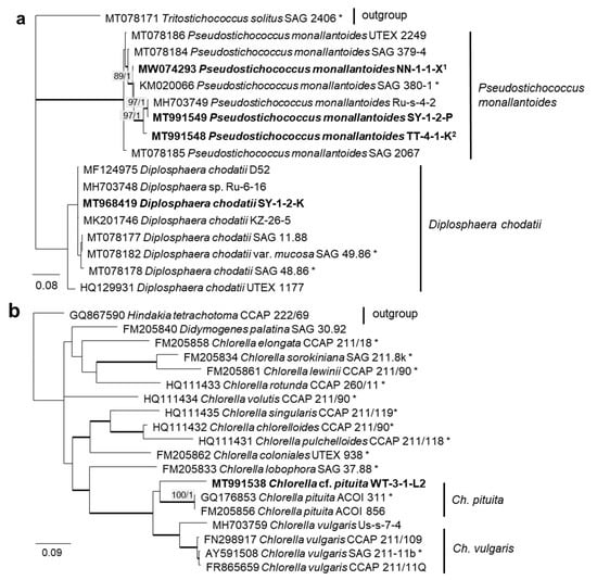 Molecular phylogeny of Trebouxiophyceae genera based on ITS-1,2 sequencing. (a) Pseudostichococcus and Diplosphaera and (b) Chlorella. The phylogenetic tree was calculated by the Bayesian method, including posterior probabilities (PP) with additional maximum likelihood bootstrap values (BP); branches are supported by both methods in bold (BP >60% and PP > 0.9). Authentic strains were marked with an asterisk, original strains from this study in bold. 1 Identical to Pseudostichococcus monallantoides WT-3-1-H (MT991551) and WT-3-1-P1 (MT991552). 2 Identical to Pseudostichococcus monallantoides TTF-2-1-BB (MT991550).