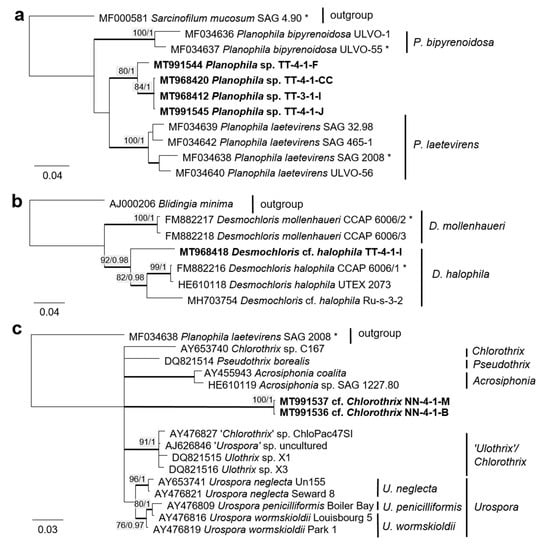 Molecular phylogeny of selected genera of the Ulvophyceae based on ITS-1,2 sequencing. (a) Planophila, (b) Desmochloris, and (c) Acrosiphonia-clade. The phylogenetic tree was calculated by the Bayesian method, including posterior probabilities (PP) with additional maximum likelihood bootstrap values (BP); branches are supported by both methods in bold (BP > 60% and PP > 0.9). Authentic strains marked with an asterisk, original strains from this study in bold.