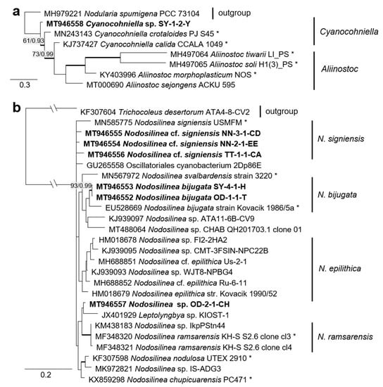 Molecular phylogeny of selected genera of the cyanobacteria. (a) Cyanocohniella based on SSU-LSU ITS sequencing and (b) Nodosilinea based on combined SSU and SSU-LSU ITS sequencing. The phylogenetic tree was calculated by the Bayesian method, including posterior probabilities (PP) with additional maximum likelihood bootstrap values (BP); branches are supported by both methods in bold (BP > 60% and PP > 0.9). Authentic strains marked with an asterisk, original strains of this study in bold.