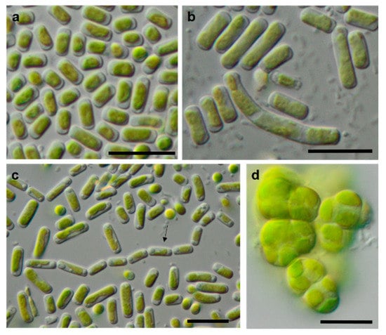 Further, the identification of some cryptic taxa characterized by simple morphology was corrected based on the integrative approach. Several strains that were initially identified as morphologically different Stichococcus species were unambiguously identified as a single species in the newly revised genus Pseudostichococcus [119] (Figure 8a), namely P. monallantoides. Likewise, some strains of Bracteacoccus minor were initially morphologically identified as several small-celled Bracteacoccus (including B. minor) and Pseudomuriella species (Figure 7a).