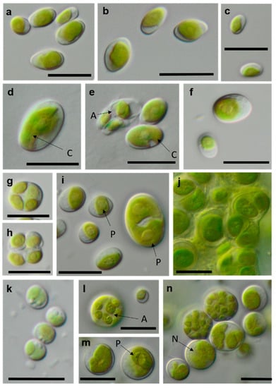 Some strains were correctly identified to the genus level or morphological species complexes. For example, several strains of the morphologically prominent genus Chloroidium, initially identified as Ch. ellipsoideum, were redefined as the morphologically close species Ch. saccharophilum and Chloroidium sp. The cells of this genus can be easily recognized by their ellipsoid shapes and characteristic chloroplast structures (Figure 13a–e) [68]. Previous identifications of the small-celled Nannochloris sp. were also confirmed by the integrative approach. However, the group of Nannochloris-like algae is problematic for identification in general and requires taxonomic revision, including strains from ecologically different environments [101,102].