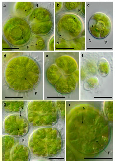 Photomicrographs of Chlamydomonadales isolates. (a,b) cf. Spongiococcum TT-3-1-M; (c–e) Borodinellopsis sp. NN-2-D (c) juvenile cell and (d) mature cell with lobed chloroplast; and (f–h) Borodinellopsis texensis NN-4-1-E (f) zoospores, (h) single cell with prominent nucleus, and one pyrenoid surrounded by several fine starch grains. Arrow labels: N = nucleus and P = pyrenoid. Scale bars: 10 µm.