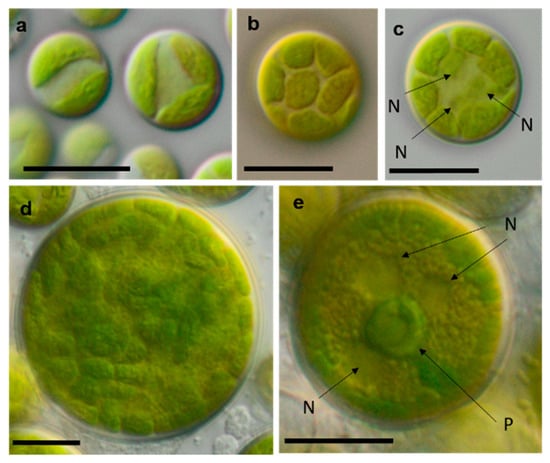 Photomicrographs of Sphaeropleales isolates. (a–d) Bracteacoccus minor (a) young cells, TTF-2-1-M and (b,c) TTF-2-1-A (b) surface view of disc-shaped chloroplasts; (c) several nuclei are visible in the cell; (d) mature cell with multiple chloroplasts, NN-4-1-CC, (e) and Tetradesmus cf. dissocuatus TT-3-1-G, a large mature cell before division containing several nuclei and a central pyrenoid. Arrow labels: N = nucleus and P = pyrenoid. Scale bars: 10 µm.