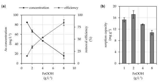Iron based phases have been shown to be generally effective adsorbents, which are suitable for removing arsenic from contaminated waters [15]. Special recognition in water treatment is given to amorphous or crystalline ferric oxides or oxyhydroxides due to their high adsorption capacity towards anionic inorganic contaminants and relatively high environmental stability of the formed sorption complexes [26]. The preferential and efficient sorption of arsenate (a dominant anionic specie under oxidative condition of soils, sediments, and surface waters) onto ferric phases is also supported by our experimental data presented in Figure 1. There, at the highest FeOOH doses, the residual concentrations of arsenic in the solution are low (down to 15.8 mg L−1), yet, still toxic and significantly over the maximum allowable level of 10 µg L−1 [14].