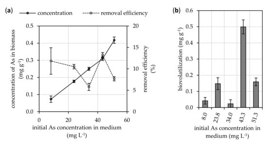 The contribution of arsenic transformation into volatile derivatives on removal efficiency by fungus was significant (Figure 2b) and accounted for up to a maximum of 0.5 mg g−1. This was noted at the initial arsenic concentration of 43.3 mg L−1 and it resulted in the highest microbially induced removal of arsenic from the culture medium with an average value of 13.2% of its initial content.