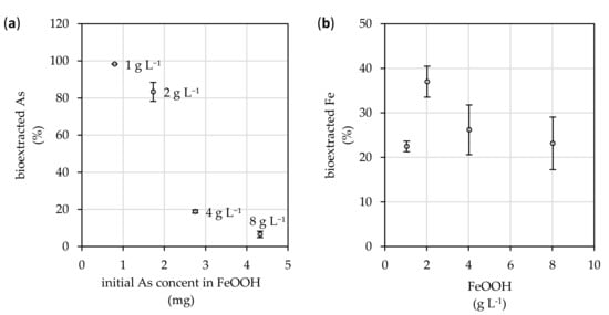The amount of bioextracted arsenic is significantly affected by the Fe:As ratio in adsorbent. With increasing iron contents, the efficiency of arsenic bioextraction significantly decreases (Figure 3a). Most of the arsenic was bioextracted into the solution by the fungal metabolites where only 1 g L−1 of FeOOH was added, while 6.5% bioextraction efficiency was noted at 8 g L−1.
