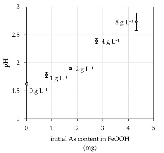 The process of bioextraction was triggered by the media acidification due to fungal metabolic activity. Figure 4 highlights that albeit the content of FeOOH suspended in culture medium, the final pH of culture media decreased below the value of 2.7. Still, the presence of arsenate-treated FeOOH suppresses the effect of acidification and, thus, the average value of pH increases from 1.6 to 2.7 with increasing suspended FeOOH content in the medium. Acidification also initiated bioextraction of iron (Figure 3b), which resulted in a significant release of iron from the crystal structure of FeOOH. It was almost 37% at 2.0 g L−1, while in the case of other FeOOH doses the bioextraction efficiency approximated 25%.