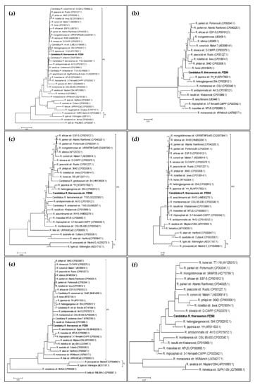 Phylogenetic trees for single genes. Neighbor-joining trees constructed with the Kimura 2-parameter method and inferred from 1000 bootstrap replicates. Only bootstrap values ≥70% are shown. The trees were drawn to scale with branch lengths indicating evolutionary distances. Gaps and missing data were deleted. Our strain under study is displayed in bold letters. (a) gltA gene showing 36 Rickettsia strains using a total of 1051 positions in the final dataset; (b) ompA gene including 21 strains and 3144 positions; (c) ompB gene including 28 strains and 4739 positions; (d) sca4 gene displaying 26 strains and constructed from 2010 positions; (e) htrA gene showing 32 strains using 413 positions; (f) 23S-5S intergenic spacer region for 21 strains and built from 345 positions in the final dataset.