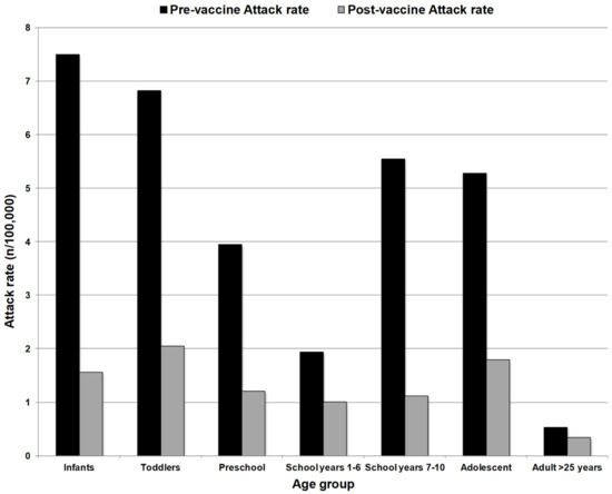 The overall incidence of group C disease in England and Wales reduced from 1.85/100,000 in 1998/1999 to 0.12 in 2003/2004 and vaccine effectiveness was found to be between 83–100%. Reductions in group C disease were also observed in those aged >25 years who had not been vaccinated, with incidence reducing from 0.55/100,000 to 0.11/100,000 between 1998/1999 and 2003/2004 [31,32]. Further evidence of herd protection was provided in an analysis by Ramsay et al. in 2003. They demonstrated a substantial reduction in the MenC attack rate among unvaccinated cohorts among all age groups, following mass vaccination with MCC in the UK (Figure 1, [33]).