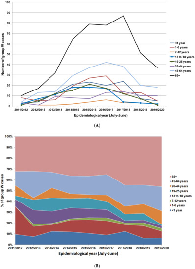 (A) Group W IMD cases in England from 2011/2012 to 2019/2020 stratified by age groups. Age groups offered vaccines are highlighted with square markers (Public Health England: unpublished data). (B) Percentage distribution of group W IMD cases in England from 2011/2012 to 2019/2020 by age group.