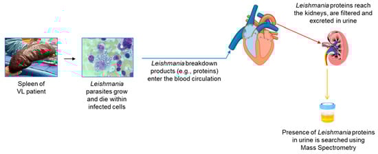 Illustration of conceptual idea and steps used to identify L. infantum L. donovani proteins in urine of patients with visceral leishmaniasis.