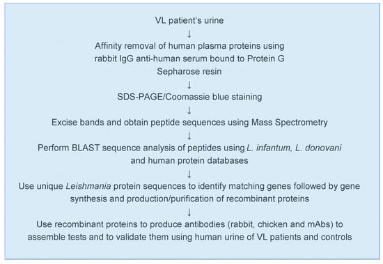 Figure 1 illustrates the conceptual idea that urine is a practical biological sample for the discovery of leishmanial biomarkers that can be used for the development of an antigen detection test for the diagnosis of VL. Figure 2 details the general experimental approach that we used for the biomarker discovery and test development.