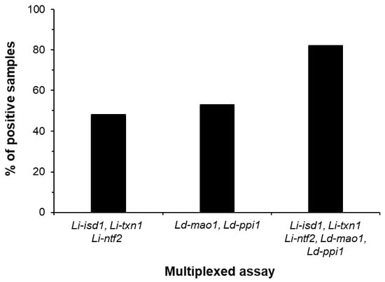 Therefore, a multiplexed ELISA designed to detect not only Ld-mao1 and Ld-ppi1 but also the previously discovered biomarkers Li-isd1, Li-txn1, and Li-ntf2 was then optimized. A pool of purified rabbit antibodies specific for each antigen was used to coat the plates and a second pool of biotinylated chicken IgY antibodies was used as the detecting reagent.