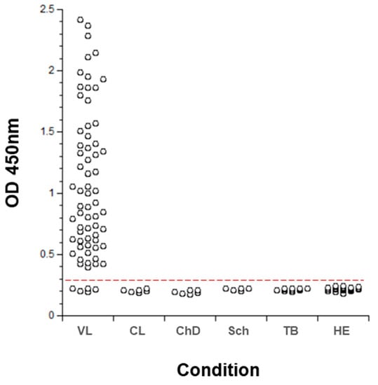- Braz, R.F.S.; Martins, D.R.A.; Wilson, M.E.; Reed, S.G.; Pearson, R.D.; Jeronimo, S.M.B.; Nascimento, E.T. The sensitivity and specificity of Leishmania chagasi recombinant K39 antigen in the diagnosis of American visceral leishmaniasis and in differentiating active from subclinical infection. Am. J. Trop. Med. Hyg. 2002, 67, 344–348. [Google Scholar] [CrossRef] [PubMed]