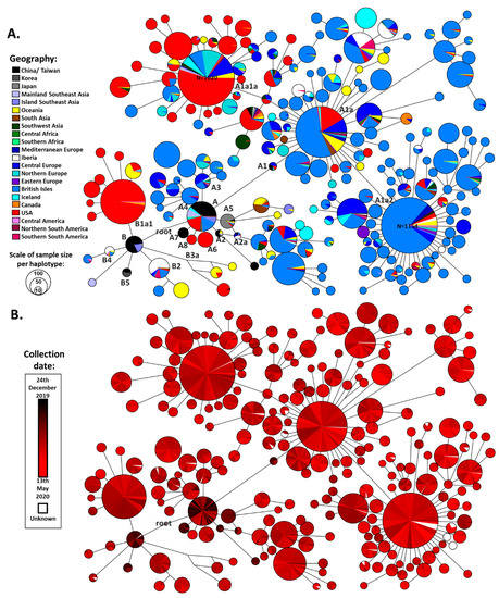 Reduced-median network of the most common haplotypes in the SARS-CoV-2 genomic database. Networks are colored according to geography (A) and the time of collection (B). Size of the circles corresponds to the number of samples with the same haplotype and a scale is provided. Two haplotypes have more samples than the limit of the software and the number of samples is provided. Links correspond to inferred mutations between haplotypes. Given the complexity of the network, the length of the links is not fully additive (i.e., exactly scaled to the number of mutations). A defined nomenclature for the nodes of this network is presented in Figure S2, Figure S1 displays the mutations between haplotypes, and branch lengths are scaled to the number of mutations in the networks in the individual networks (Figures S7–S57).