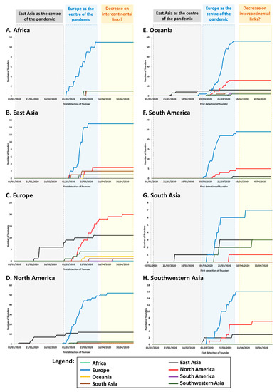 We established the cumulative distribution of the number of founders in each continent/region according to the source of each founder. Again, we focused on the numbers of founders and not their impact (frequency) in the sink population. While the phylogeographic signal could be captured well with even a low sample size, the frequency depended much more on the number of sequences carried out for each country (Table S3). The results are shown in Figure 2. We used the time of first detection of each founder (Table S3) minus five days as a proxy for the time of arrival. It is known that the incubation period until symptoms/detection of COVID-19 can be as high as a 11 days, with an average of around five days [39].