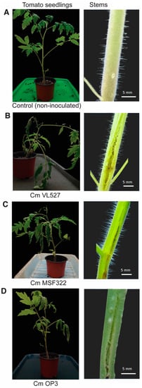 - Chalupowicz, L.; Barash, I.; Reuven, M.; Dror, O.; Sharabani, G.; Gartemann, K.-H.; Eichenlaub, R.; Sessa, G.; Manulis-Sasson, S. Differential contribution of Clavibacter michiganensis ssp. michiganensis virulence factors to systemic and local infection in tomato. Mol. Plant Pathol. 2016, 18, 336–346. [Google Scholar] [CrossRef] [PubMed]