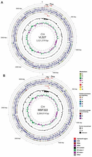 Schematic representation of the chromosomes of the Chilean strains VL527 and MSF322. The chromosome of C. michiganensis subsp. michiganensis strain VL527 has a size of 3,321,579 bp, 3067 coding sequences, 6 rRNA, and 52 tRNA (A); the chromosome of strain MSF322 has a size of 3,284,014 bp, 3039 coding sequences, 6 rRNA, and 53 tRNA (B). Rings from inside to outside: GC skew (+/−) (1); GC content (2); Predicted genes in reverse strand (4); Predicted genes in forward strand (5); predicted pathogenicity island (chp/tomA region) in reverse and forward strands based on BLASTN (3,6) (7). Gene function predictions were annotated, based on clusters of orthologous groups (COG) categories. The chromosome maps were generated, using CGview.