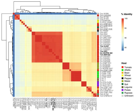 Genome–genome comparisons of representative strains of Clavibacter species, including the Chilean C. michiganensis subsp. michiganensis strains, VL527, MSF322 and OP3. Clustering based on ANIm analysis of 49 strains listed as C. michiganensis is shown (left). Chilean C. michiganensis subsp. michiganensis strains VL527, MSF322, and OP3 (bold, asterisk) are grouped within the main C. michiganensis cluster, together with the reference C. michiganensis subsp. michiganensis strain NCPPB 382 (bold). Strains of C. michiganensis subsp. michiganensis (Cm), C. capsici (aCc), C. michiganensis subsp. californiensis (bCcf), C. michiganensis subsp. chilensis (cCch), C. michiganensis subsp. phaseoli (Cp), C. insidiosus (Ci), C. nebraskensis (Cn), C. sepedonicus (Cs), C. tessellarius (Ct) species, endophytic strains (underlined) and strains of Clavibacter sp. (Csp), i.e., with no designated subspecies were included in the analysis. Isolation sources of strains are indicated (right) and corresponding countries of origin are indicated before each strain name: Canada (CA), Chile (CL), China (CN), Czech Republic (CZ), Hungary (HU), South Korea (KR), Spain (ES), the Netherlands (NL), United Kingdom (UK), United States (US), and of unknown origin (UN). ANIm similarities are shown in Table S5.