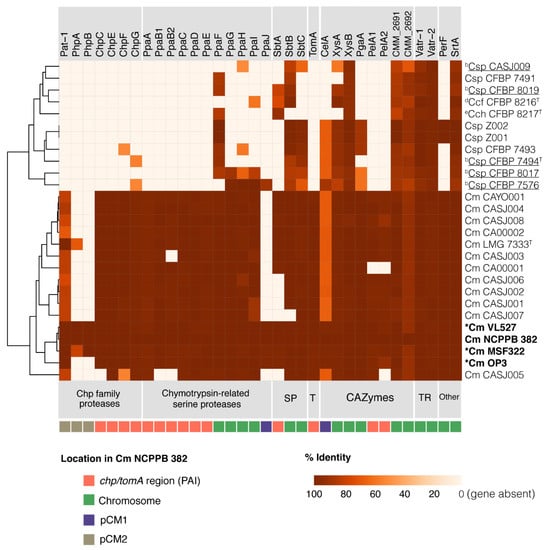 Heatmap of genes associated with virulence in C. michiganensis subsp. michiganensis pathogenic and non-pathogenic strains. Chp family proteases, chymotrypsin-related proteases, subtilase proteases (SP), tomatinase (T), carbohydrate active enzymes (CAZymes), transcriptional regulators (TR), and other virulence-related genes (Other) are shown in C. michiganensis subsp. michiganensis and endophytic strains (underlined). Heatmap shows identity (%) related to the corresponding amino acid sequences of strain NCPPB 382. Gene locations in the strain NCPPB 382 genome (PAI, chromosome, pCM1, pCM2) are indicated. Identity percentages are indicated in Table S6.