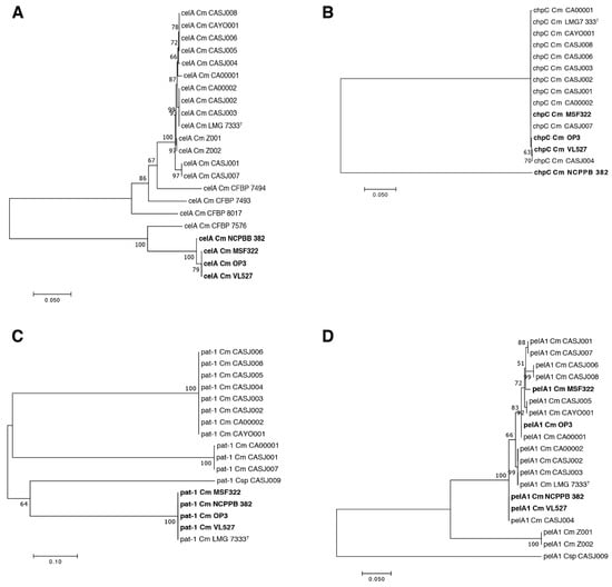 Phylogenetic relationships of the celA, chpC, pat-1 and pelA1 genes were assessed to further characterize key genetic determinants for pathogenicity in the Chilean strains VL527, MSF322 and OP3. The celA genes of strains VL527, MSF322 and OP3 group in a monophyletic clade, together with the celA gene of C. michiganensis subsp. michiganensis strain NCPPB 382 and other pathogenic strains (Figure 6A). The chpC gene of Chilean strains VL527, MSF322 and OP3 and other pathogenic strains clustered in a monophyletic clade, except for the gene of strain NCPPB 382, which comprises a singleton (Figure 6B). As shown in Figure 6C, three distinguishable clusters of the pat-1 gene were observed. The pat-1 gene of strains VL527, MSF322, OP3, NCPPB 382 and LMG 7333T appeared as a monophyletic group. The pelA1 and pat-1 genes of the endophytic strain CASJ009 are distantly related to the pelA1 and pat-1 genes of other C. michiganensis pathogenic strains, conforming singletons. The pelA1 gene of strains VL527, MSF322 and OP3 grouped in three different clusters (Figure 6D), showing that the pelA1 gene of strain VL527 is closely related to the pelA1 gene of strains NCPPB 382 and CASJ004. The pelA1 gene of MSF322 is closely related to pelA1 genes of strains CASJ006 and CASJ008, while the pelA1 gene of strain OP3 clustered with pelA1 of strain CA00001.