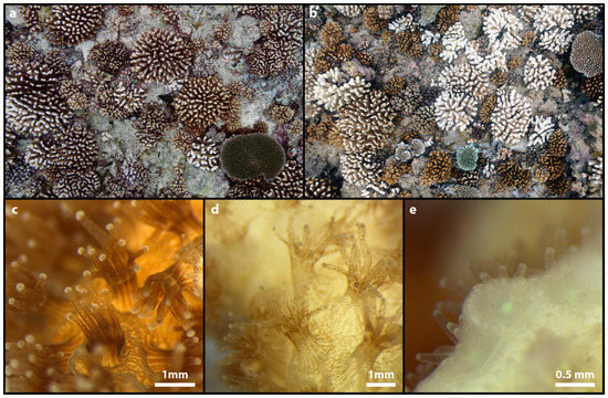 Coral bleaching. The upper photographs show a reef landscape (reef slope) before (a) and during (b) the massive bleaching event of 2016 at Moorea, French Polynesia. The bottom macro-photographs show a close-up lateral view of the polyps of the scleractinian coral Pocillopora damicornis experiencing bleaching: unbleached (healthy) polyps with visible Symbiodiniaceae (c), partially bleached polyps with low density of Symbiodiniaceae (d), and bleached polyps without Symbiodiniaceae and transparent tissue (e). Photographs are courtesy of Y. Chancerelle (a, b), and L. Hédouin (c–e) (CRIOBE, Moorea).