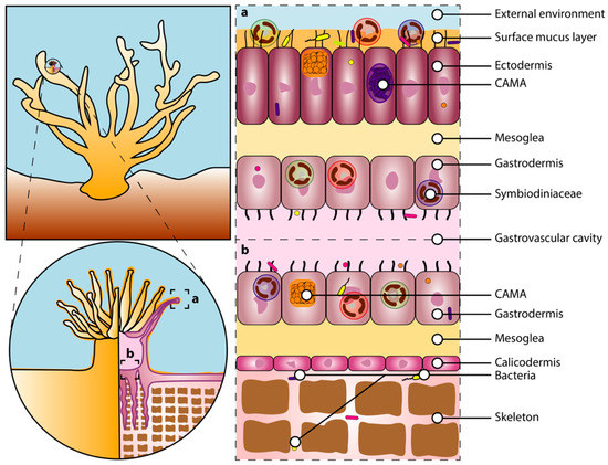 Coral microhabitats and their associated microorganisms. The diagram on the left illustrates a healthy coral (top) and a close-up transversal view of one polyp to illustrate the tissue layers (bottom). Diagrams on the right represent a close up of a cross-section of the coral tissues of a tentacle (a) and the basal part of the polyp (b), showing the distribution of the Symbiodiniaceae, bacteria, and cell-associated microbial aggregates (CAMAs) in the external environment, surface layer, ectodermis, gastrodermis, gastrovascular cavity, and skeleton. The size of the Symbiodiniaceae and microbes has been modified for illustration purposes. For an accurate size representation, see [90,91,92].