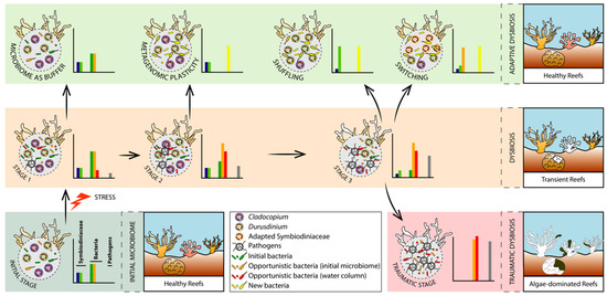 The adaptive dysbiosis hypothesis (ADH) stands on the principle that the microbiota confers resistance and resilience to its host via functional redundancy (reviewed in [220]), and is suspected to be involved in coral stress tolerance [221,222]. A large body of work has provided evidence for microbial flexibility (dynamic restructuring of microbial symbionts under changing environmental conditions) as a mechanism for coral environmental adaptation and bleaching tolerance (reviewed in [223]). Dysbiosis between corals and their associated microbiota may confer novel adaptive capabilities to environmental changes. Such an adaptive process occurs as long as the coral host can quickly revert back to a healthy state (eubiosis) by recovering a better suited Symbiodiniaceae assemblage, either by recruiting exogenous species from the surrounding environment (switching) or adjusting the relative abundance of native species from a low-abundance background (shuffling) [224,225]. The microbiota may act as a buffer to delay the coral–Symbiodiniaceae breakdown by maintaining essential functions when facing weak disturbances [167,173]. Microbial dysbiosis can thus provide a potential source of adaptive variation via diverse processes that provide physiological changes essential to support the coral–dinoflagellate symbiosis. Those processes include shifts in microbial gene expression [226,227], changes in microbiota taxonomic composition [130] and recruitment of new microbial species [186]. The restructuring of microbial communities, i.e., the addition or loss of microbial species, as well as changes in their relative abundances, is termed metagenomic plasticity [228], and has been suggested as an important mechanism of coral host plasticity and adaptation [31,130,161]. When exposed to strong disturbances that exceed the buffering capacity of the microbiota, corals can shift Symbiodiniaceae types to enhance resilience to environmental changes [225,229,230]. Both switching and shuffling processes can translate into transient bleaching states, waiting for the coral holobiont to adapt and recover to a healthy state. Elevated temperature and light incidence, along with the accumulation of ROS, photoinhibition, and metabolic dysfunctions of the cnidarian–Symbiodiniaceae symbiosis [231,232], may initiate the expulsion of the Symbiodiniaceae cells. If the environmental stressor persists and exceeds the buffering capacity of both microbial and dinoflagellate partners, then a “traumatic” dysbiosis occurs where coral bleaching is irreversible due to the permanent loss of the Symbiodiniaceae, often accompanied by the occurrence of opportunistic and invading pathogens. Accordingly, we propose the succession of three holobiont dysbiosis stages to define coral bleaching (Figure 3):