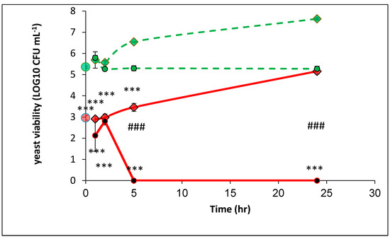 ). P value (t test): significance of the CFU count in each examined time related to its control *** p < 0.001; significance of the CFU of the treated yeast in PBS related to YMB, in each examined time ### p < 0.001.