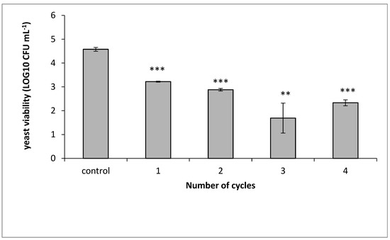 3.4. Yeast Eradication as a Function of PEF Treatment-Cycle Mode