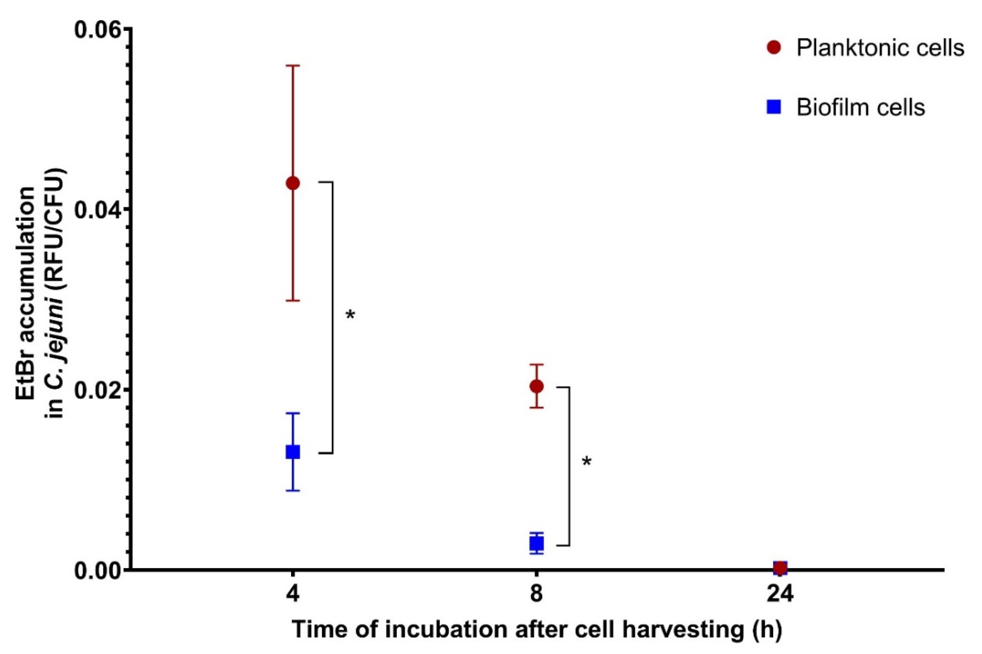 3.5. Efflux Pump Activity of Planktonic and Biofilm Cells