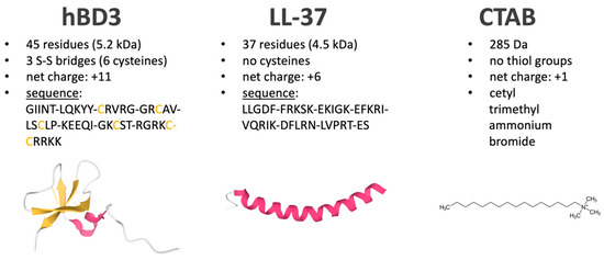 Characteristics of applied stress inducing components hBD3, LL-37, and CTAB. Beta-sheets and cysteines are colored in orange. Alpha-helices are colored in magenta. hBD3 structure (PDB ID: 1KJ6) was obtained from [7] and LL-37 structure (PDB ID: 2K6O) from [8]. Images of structures were created using Mol* [9].