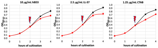 Effect of hBD3, LL-37, or CTAB on the growth of Streptococcus pneumoniae D39, respectively. The red arrow indicates the application of either compound after two hours of cultivation. Growth curves obtained under control condition are colored in black. Growth curves obtained under stress condition are colored in red. Error bars represent the standard deviation. n = 4 (hBD3), n = 6 (LL-37) [6], n = 4 (CTAB).