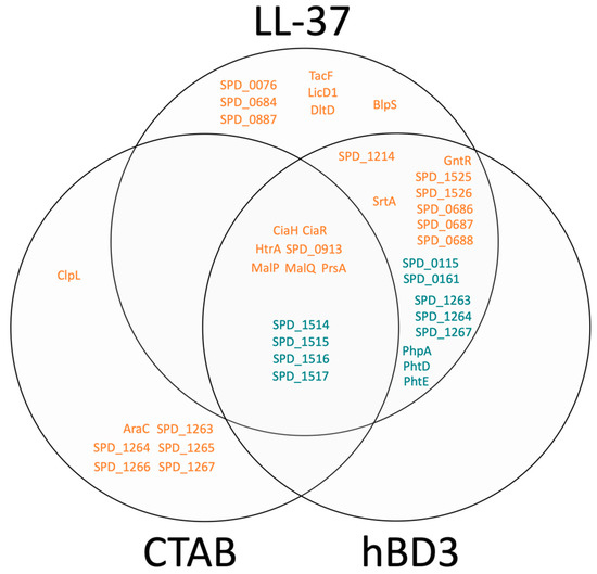 In contrast to the relatively high correlation between proteomic changes in the pneumococcus seen after treatment with either hBD3 or LL-37 (except from changes in abundance of cell surface proteins), the modification of the bacterial proteome in response to general membrane stress induced by the cationic detergent CTAB was rather different (Figure 3). No significant changes in cell surface modification proteins, virulence proteins, the GntR regulator, many transporters under control of GntR (SPD_0686–SPD_0688 and SPD_1525–SPD_1526) and the transporters SPD_1214, SPD_0115, or SPD_0161 could be detected. Additionally, the transporter proteins and AraC family regulator SPD_1262–SPD_1267 were all significantly more abundant after CTAB stress (mainly with fold changes of over 10), whereas these proteins were not changed or even (significantly) less abundant in response to hBD3 and LL-37, respectively. Moreover, the Clp protease subunit ClpL (SPD_0308) showed a 7-fold change after CTAB treatment but was not affected by any of the examined AMPs. Interestingly, the two-component system 05 also appeared to be activated by CTAB. Similar to the proteomic changes induced by hBD3 and LL-37, respectively, CiaH, CiaR, and the aforementioned targets of this regulatory system were all more abundant after CTAB stress, even when the detected protein fold changes were less pronounced compared to the changes induced by the two antimicrobial peptides. Hence, general membrane stress triggered by the detergent CTAB affected the same regulatory system as the antimicrobial peptides hBD3 and LL-37 in our in vitro experimental setup. Additionally, the unknown function proteins SPD_1515–SPD_1517 and the transporter SPD_1514 were, as in response to AMP treatment, less abundant after CTAB application. This effect can possibly be explained by a general attraction of positively charged molecules (cationic detergent CTAB and AMPs) by these putative membrane proteins.
