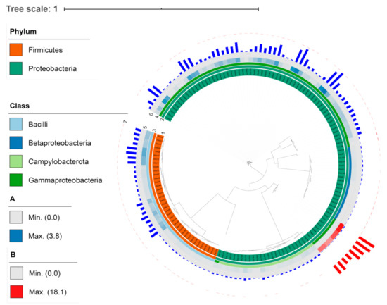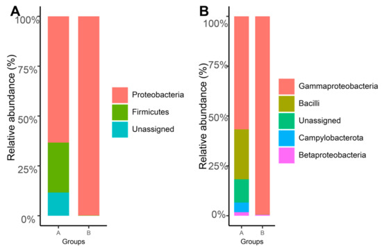 A total of 201 ZOTUs were identified from the samples. Notably, the six ZOTUs of the non-bacterial sequence (mostly chloroplasts) were not included for further analysis. The sequencing depth was 34,128 reads for all samples after resampling. The sequencing effort of G. haimaensis (A) and A. marissinica (B) was shown to reach the saturation stage with increasing numbers of samples, and hence, this investigation has captured most of the gill-associated microbes (Figure S1). Moreover, the taxonomic composition of the microbial communities at the phylum (Figure 2A) and the class (Figure 2B) level were illustrated differently, respectively. Accordingly, the ZOTUs were mainly assigned to the two phyla namely Proteobacteria (57.44%) and Firmicutes (19.49%). At the phylum level, the ZOTUs affiliated to phylum Proteobacteria could be subgrouped into classes Betaproteobacteria, Gammaproteobacteria, and Campylobacterota, where the dominant class was Gammaproteobacteria (35.38%). The taxonomic composition of A. marissinica only consisted of phylum Proteobacteria at the phylum level and consisted of classes Gammaproteobacteria and Betaprotebacteria, where G. haimaensis had four classes (Figure 2B). From the circular phylograms (Figure 3), it showed the taxonomical composition and relative abundance of G. haimaensis (Group A) and A. marissinica (Group B).
