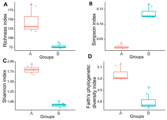 Illustrations on the taxonomic (Richness, Simpson, and Shannon diversity index) and Faith’s phylogenetic alpha diversity index of the microbial communities are indicated in Figure 4. Based on these indices, significant differences between G. haimaensis (Group A) and A. marissinica (Group B) were noted (p < 0.05). Moreover, higher Richness index, Shannon index, and Faith’s phylogenetic diversity index existed in G. haimaensis. For G. haimaensis, the average richness index was 145, while that of A. marissinica was 77. At the phylogenetic level, the average Faith’s phylogenetic diversity index of G. haimaensis was 5.03, and the value was 4.80 for A. marissinica (p < 0.01).