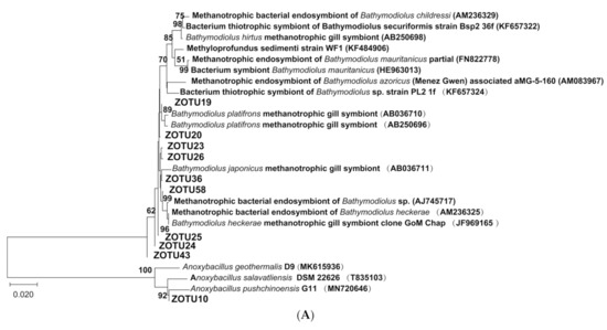 Studies on microbial communities, especially the compositional and functional diversities of chemosynthetic microbial communities, have attracted great attention in the extremophilic deep-sea biotopes. The advancement of new research tools has immensely accelerated research progress [11,43,44]. In this study, the obtained ZOTUs were assigned to two phyla and four classes. The phylum Proteobacteria and class Gammaproteobacteria were predominant on the phylum and class level, respectively. The taxonomy composition of bathymodiolin mussel G. haimaensis and vesicomyid clam A. marissinica were shown to be distinct (Figure 2). Moreover, the alpha diversity in G. haimaensis was significantly higher than in A. marissinica both at the taxonomic and phylogenetic levels (Figure 4). Besides the phylum Proteobacteria, the phylum Firmicutes has also been found in G. haimaensis in our study. Microbes affiliated to this phylum were widely distributed in diverse ecological habitats with the spore-forming ability to cope with environmental challenges, such as heat, desiccation, presence of organic solvents and oxidizing agents, and UV irradiation [45]. The gill-associated microbes of bathymodiolin mussel G. haimaensis collected in 2018 in Haima cold seep mainly consisted of Gammaproteobacteria (93.12%) and Campylobacterota (6.88%) at the class level, whereas the most predominant Gammaproteobacterium was methanotrophic microbe predicted by phylogenetic analysis [16]. Similarly, our investigation result showed that nine of the top 10 high abundant ZOTUs in G. haimaensis clustered closely with the methanotrophic microbe, and they belonged to class Gammaproteobacteria (Figure 5A). Moreover, Coykendall et al. (2019) has reported that a methanotrophic phylotype were predominate in all gill microbial samples from Baltimore Canyon seep located in the U.S. Atlantic margin [46]. As for A. marissinica in Haima cold seep, no study was conducted on its taxonomic composition of microbial communities available, although some research has been conducted on the host-symbiont interactions [9].