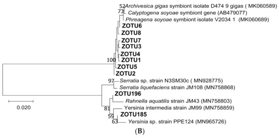 Figure 5. Phylogenic tree of the gill-associated microbes in G. haimaensis (A) and A. marissinica (B) for their top 10 high abundance ZOTUs (zero-radius operational taxonomic units) and their reference sequences, respectively, inferred from the Neighbor-Joining (NJ) analysis. The ZOTUs in (A) indicated the top 10 ZOTUs in G. haimaensis, and the ZOTUs in (B) indicated the top 10 ZOTUs in A. marissinica. The bootstrap values (> 50%) of relevant nodes are shown based on 1000 replicates. Sequences from this study are shown in bold. Scale bars: 2% of the estimated sequence divergence.