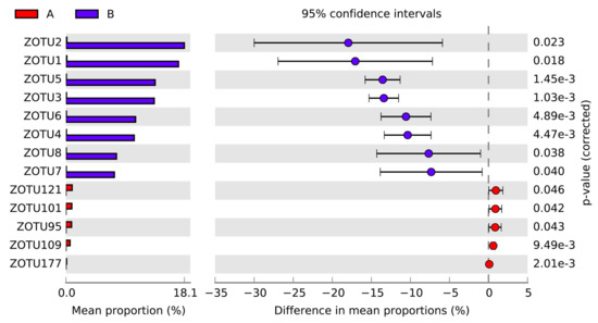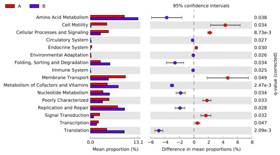 40. Parks, D.H.; Tyson, G.W.; Hugenholtz, P.; Beiko, R.G. STAMP: Statistical analysis of taxonomic and functional profiles. Bioinformatics 2014, 30, 3123–3124. [Google Scholar] [CrossRef]