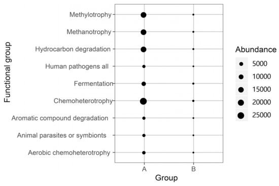 Figure 7. The bubble plot of the function groups predicted against the FAPROTAX database for G. haimaensis (Group A) and A. marissinica (Group B).
