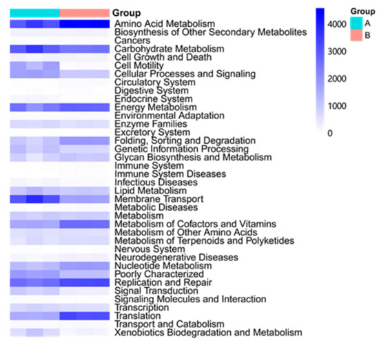 Figure 8. The heatmap of KO groups predicted by PICRUSt analysis in G. haimaensis (Group A) and A. marissinica (Group B) at KEGG level 2.
