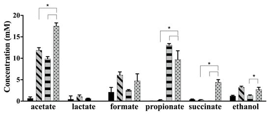 The concentration of acetate, butyrate, lactate, formate, ethanol, propionate and succinate were determined through single-dimension proton nuclear magnetic resonance (1D 1H NMR) following a previously described protocol [