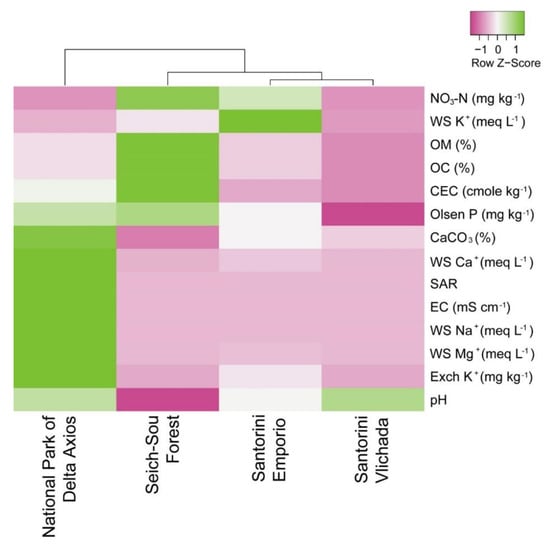 Heatmap of the chemical properties of the soils collected from sampling sites. Columns are mean centred with pink colouring representing low values, and green colouring representing high values. The Average Linage clustering method with Euclidean distances was used to cluster the sampling sites (in respect to soils’ properties). WS, water soluble; OM, Organic Matter; OC, organic C; CEC, Cation Exchange Capacity; SAR, Sodium Absorption Ratio; EC, electrical conductivity of the saturation extract; Exch., exchangeable.