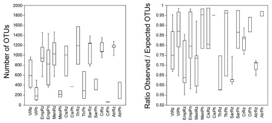 Furthermore, OTUs were classified as abundant when their total number of reads exceeded the 0.2% of the total number of reads of the entire dataset (i.e., >900 reads in all samples in these OTUs). In order to identify OTUs with ubiquitous presence in all plants and locations, pointing out to a common bacterial community shared between plants regardless of soil properties, plant characteristics, plant compartment examined, location and environmental conditions, the Levins’ index was calculated []. Levins proposed that niche breadth could be estimated by measuring the individuals’ uniformity of distribution among the resource states. For this, specialization of each individual OTU was calculated according to Pandit et al. [], using Levins’ niche width (B) index []: