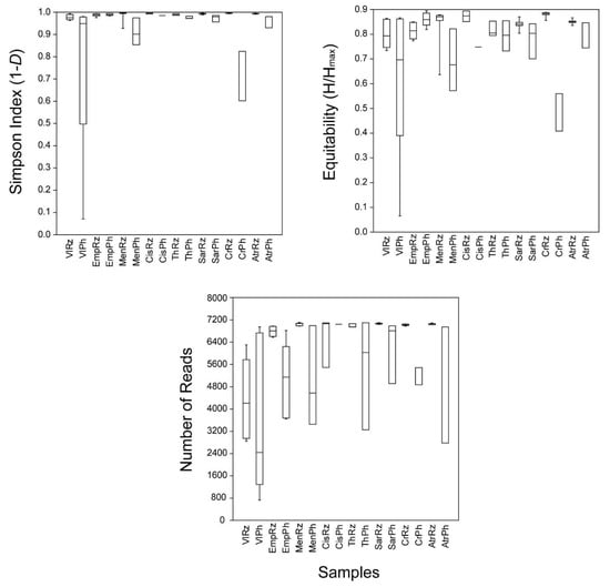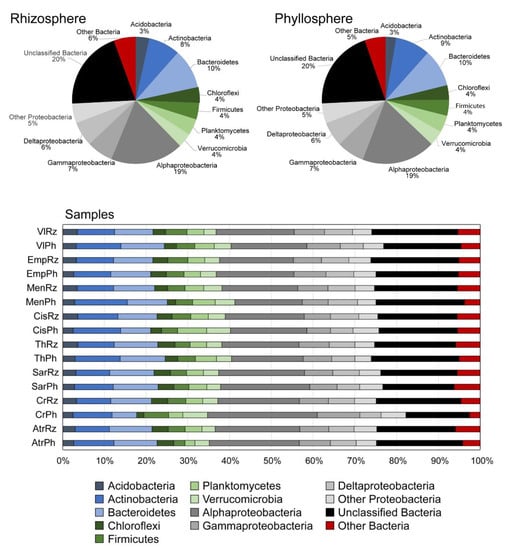 In the past decade, the advances of High-Throughput Sequencing (HTS) approaches have been extensively used to investigate bacterial diversity in various systems [,]. These approaches have revealed a vast inter—and intraspecies diversity of 16S rRNA gene sequences and have suggested the existence of highly complex functions and biotic interactions within the microbiomes of plants [], previously undetected with classical culture techniques []. The HTS tools have been used to assess and reveal the whole bacterial diversity of the rhizosphere [] and the phyllosphere [] of various plants, indicating that the phyllospheric communities were overall less diverse than the rhizospheric ones []. To the best of our knowledge, no studies have been conducted investigating simultaneously the rhizospheric and phyllospheric bacterial communities’ composition and structure of native wild plants grown under naturally stress conditions in saline and drought-stricken areas of the Mediterranean region.