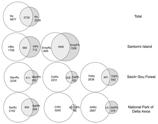 Rhizospheric samples were found to be more diverse than phyllospheric ones in all locations and plants, with higher overall OTUs richness in all cases. In addition, commonly found OTUs between the rhizosphere and the phyllosphere of the same plant represented only a portion of the total number of OTUs detected in either plant compartment; overall only 3735 out of the 16,355 were common between the two plant compartments (Figure 4). Evidently, in most of the cases the phyllospheric samples per plant that were included in the analysis were fewer than the rhizospheric ones. In the case of the tomato plants of Vlichada and Emporio and Thymus sp. of the Seich-Sou forest (which included the same number of analysed samples for each compartment), the number of OTUs detected in the rhizosphere was much higher (Figure 4). Taking into consideration that the rhizospheric and phyllospheric samples appeared to consist of heterogenous bacterial assemblages between them, the beta diversity of the bacterial communities of all plants in one location was for both compartments higher than 0.85 regardless the sampling site, attributed to turnover of >0.77. The nestedness remained low with the lowest values being computed for the plants in the National Park of Delta Axios (Table 2).