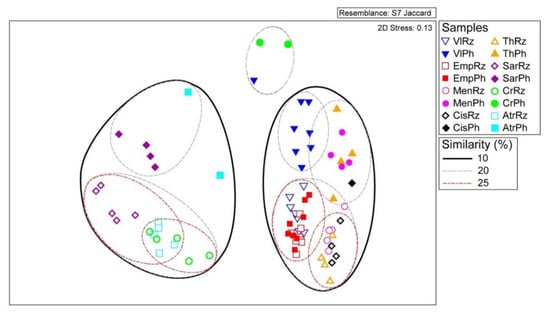 All analyses were performed on the rarefied dataset. Alpha-diversity estimators (the richness estimator SChao1, the Simpson, and Equitability indexes) were calculated for all samples with the PAST 3.16 software []. One-way analysis of similarities (ANOSIM) based on Bray-Curtis dissimilarity coefficient was used to examine whether the similarity in bacterial composition of the phyllosphere and rhizosphere between sites was greater than or equal to the similarity within the sites. Then, we used one-way permutational multivariate analysis of variance (PERMANOVA) based on the Bray-Curtis dissimilarity coefficient in the PAST 3.16 software [] to test whether the soil properties separate the rhizospheric bacterial assemblages of the different sampling sites. To compute beta diversity of the plants’ bacterial assemblages for each sampling site for the rhizosphere and phyllosphere separately, we used the ‘betapart’ R package version 1.5.1 []. Beta diversity is a measure of the difference in species composition between two or more local assemblages [], partitioned into two components according to Baselga et al. [,]: (i) spatial turnover in species composition, measured as Simpson dissimilarity (bSIM); and (ii) variation in species composition due to nestedness (bNES) measured as nestedness-resultant fraction of Sorensen dissimilarity. Based on the above, there are two potential ways in which two or more assemblages can be different: one is species replacement (turnover) and the second is species loss or gain, which implies that the poorest assemblage is a subset of the richest one (nestedness). Then, the bacterial assemblages of the different samples (both rhizosphere and phyllosphere samples) were compared using the Plymouth routines in the multivariate ecological research software package PRIMER v.6 []. The Jaccard similarity coefficients were calculated based on OTUs presence/absence data, to identify interrelationships between samples and construct an nMDS plot.