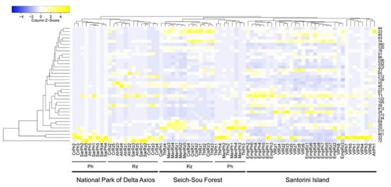 Tomato rhizosphere and phyllosphere samples were collected from eight individuals in each tomato field in the Santorini Island on June 2019, grown under drought conditions. The local tomato cultivar is well-adapted to soils with volcanic properties, high light intensity and temperature, and zero irrigation scheme. No chemical pesticides for common diseases were applied for several weeks prior sampling, while basic fertilization was applied to the soil prior sowing of the seeds. Regarding the other two sampling sites, three characteristic dominant plants from each area, and five individuals from each plant were sampled. In the forest of Seich-Sou, which is characterized by acidic soils, the plants sampled were the drought-tolerant aromatic Cistus sp., Thymus sp., and Mentha pulegium (September 2018), after a period of 38 days with no rainfall in the area (climatological data of HAO DEMETER). In the National Park of Delta Axios, samples from the native halophytes Sarcoccornia sp., Atriplex sp., and Crithmum sp. were collected in June 2018. This wetland covers >33,000 hectares of land, includes estuaries of four rivers and has been included in the Natura 2000 network of European ecological regions []. The sampling site in the wetland was located proximate to the estuary of the River Axios, an either saline or sodic environment, characterized by alkaline soils. All plant samples were placed in sterile bags and brought back to the lab under sterile and cold conditions within 6 h.